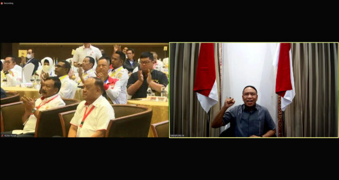 JAKARTA – Menteri Pemuda dan Olahraga Republik Indonesia (Menpora RI) Zainudin Amali memberi arahan secara virtual pada Rapat Kerja Nasional (Rakernas) KONI Pusat, dari Bandara Internasional Ngurah Rai, Bali, Senin (13/3) pagi.